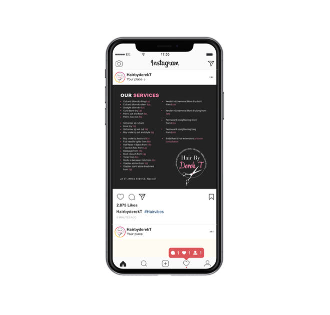 Hair by Derek T is a hairdressing business located in North London. I had the privilege of developing the initial branding and overall aesthetic for the company. This included designing a logo, flyer, social media posts, and business cards. After discussing with my client, we decided on a clean and sleek design with vibrant pink accents.